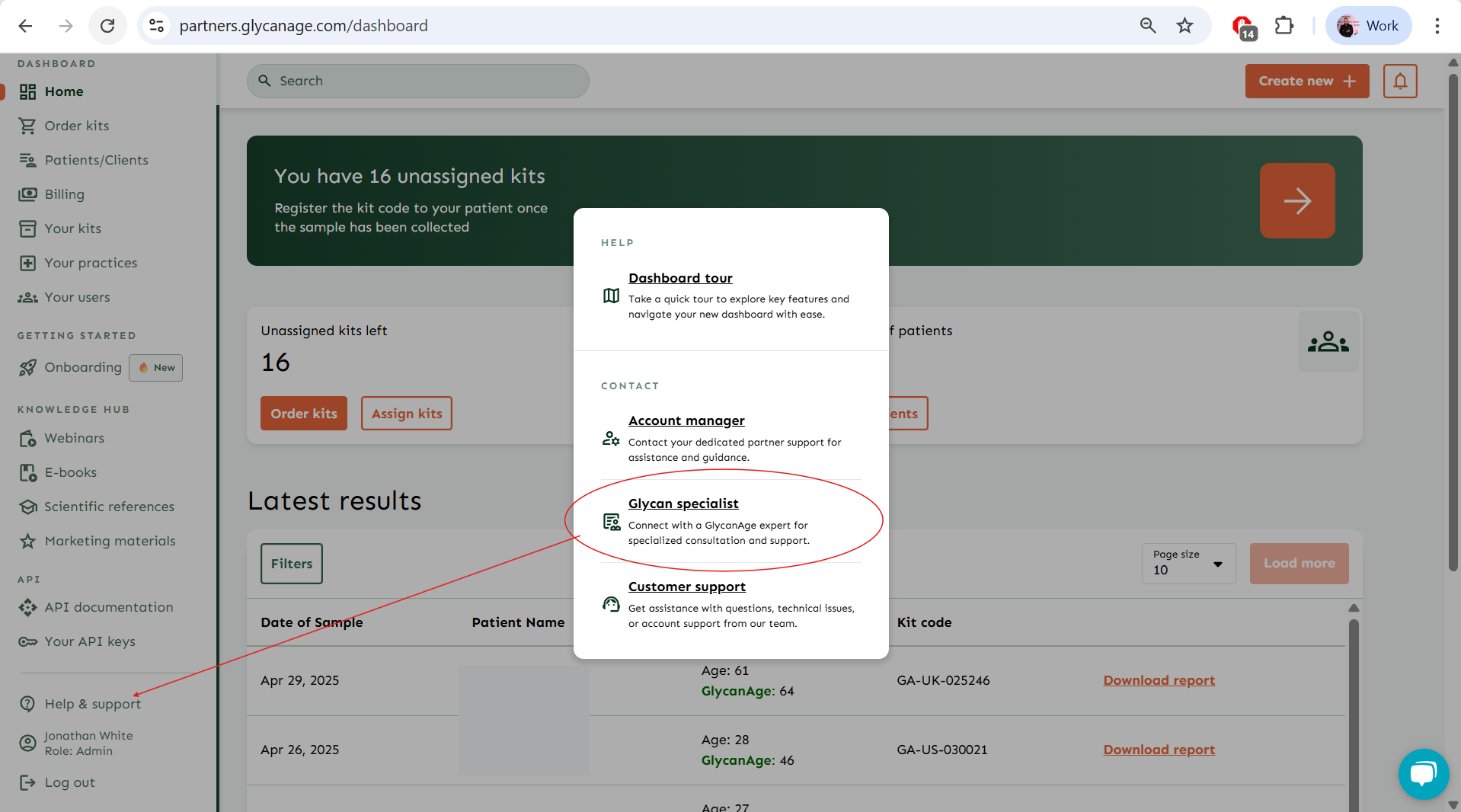 You can access the menu to book results interpretation calls with us through this section of your GlycanAge partner dashboard.